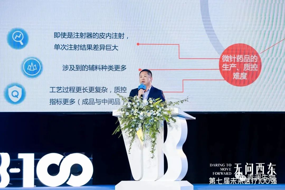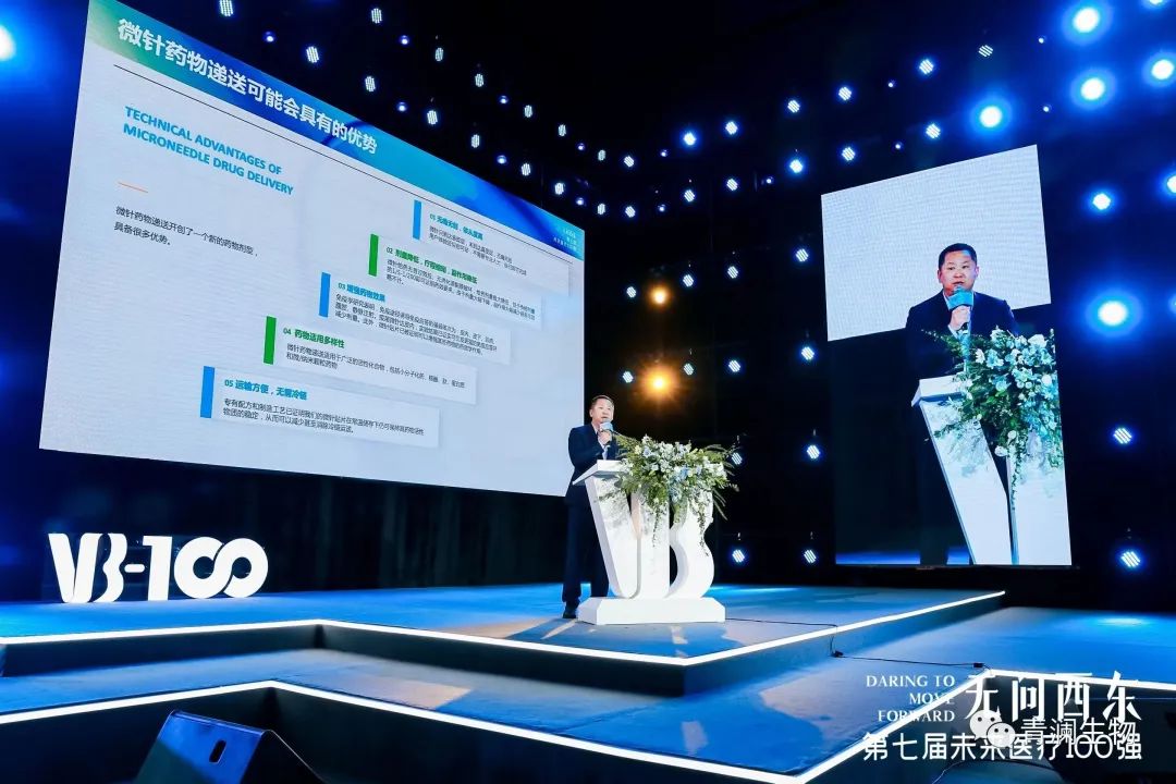 ▲青瀾生物創(chuàng)始人兼總經(jīng)理江林博士于未來醫(yī)療100強大會·百強峰會主論壇發(fā)表關(guān)于可溶解微針?biāo)幬锼帉W(xué)研究、臨床以及商業(yè)化策略演講