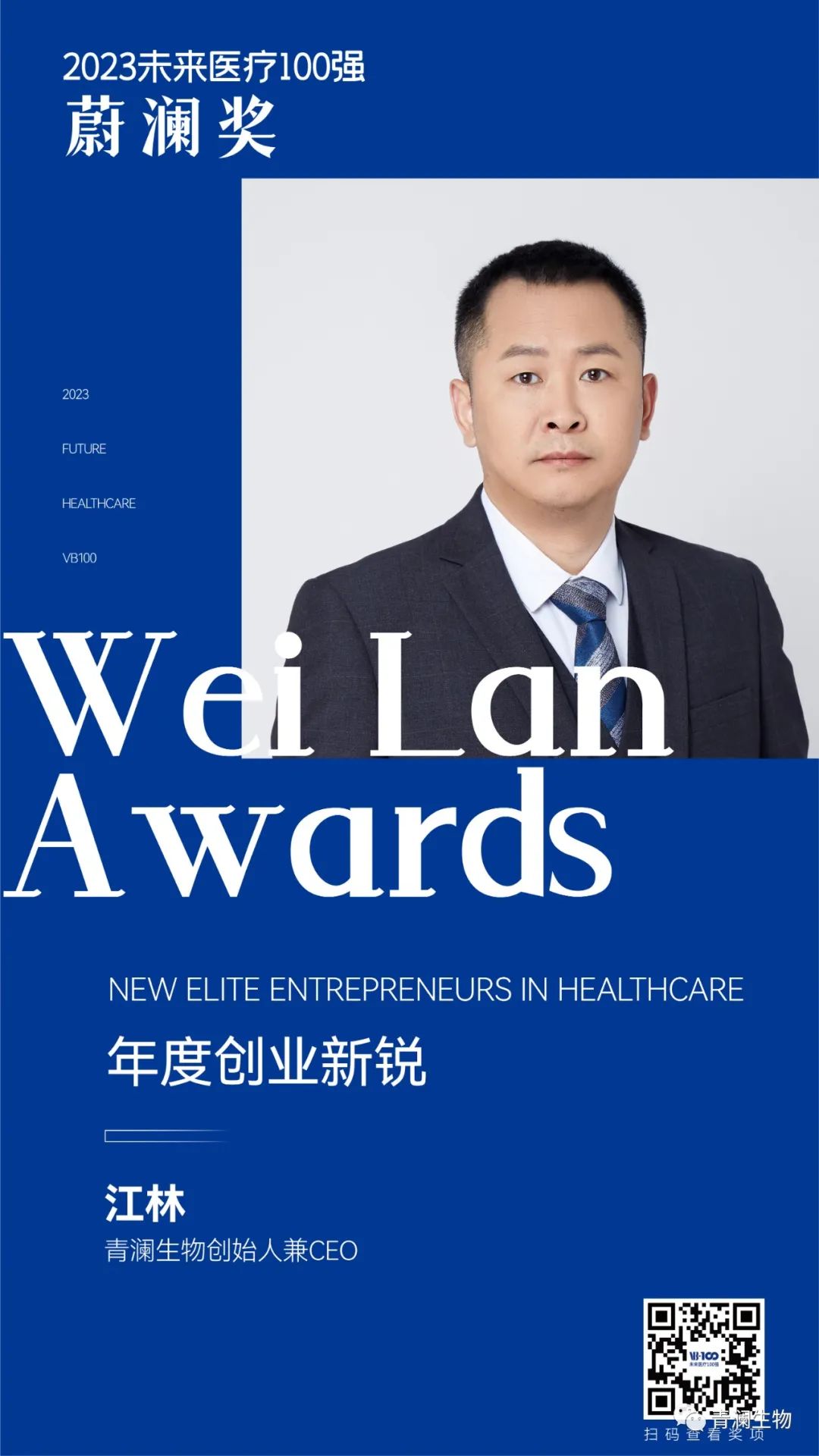 5月6日晚,大會的百強頒獎晚宴上發(fā)布了2023年未來醫(yī)療100強榜單。憑借在可溶解微針領(lǐng)域的領(lǐng)先實力和創(chuàng)新能力,青瀾生物本次上榜未來醫(yī)療100強·創(chuàng)新醫(yī)療商業(yè)及供應(yīng)鏈服務(wù)榜TOP100 ,創(chuàng)始人兼總經(jīng)理江林博士榮獲蔚瀾?yīng)劇つ甓葎?chuàng)業(yè)新銳榮譽。
